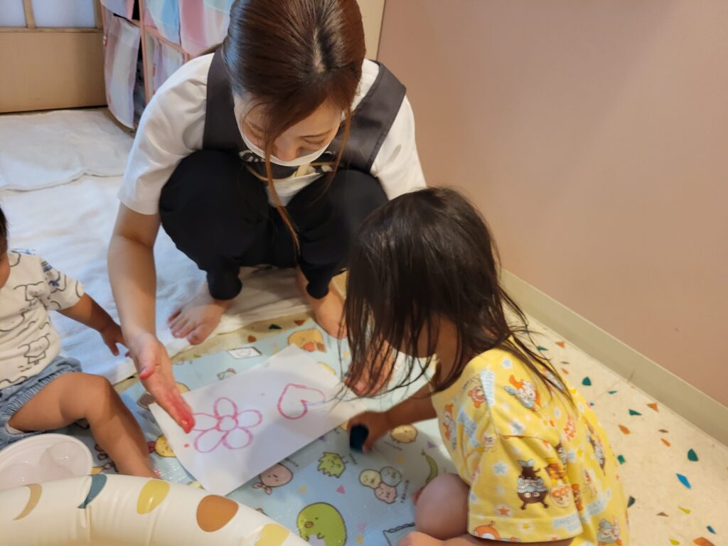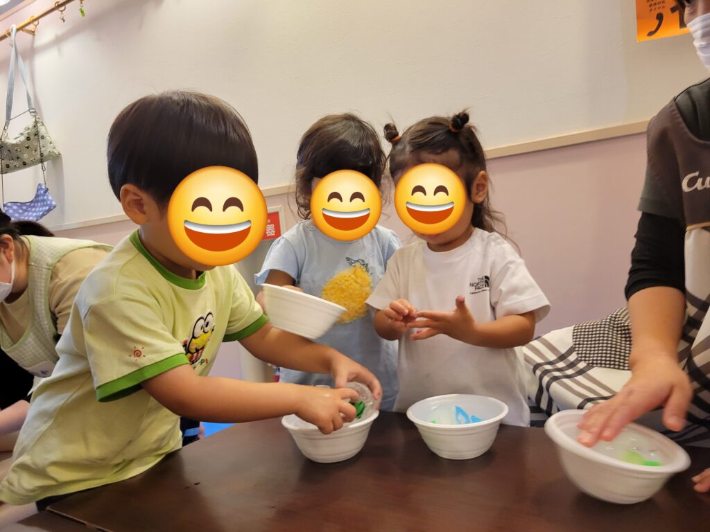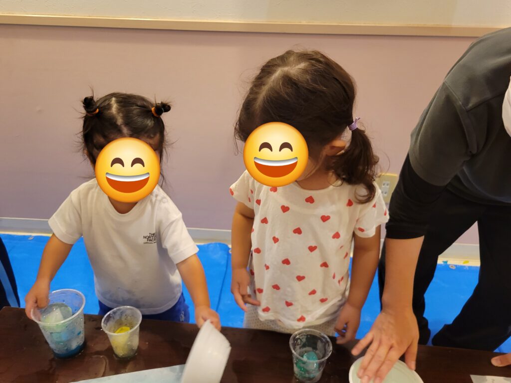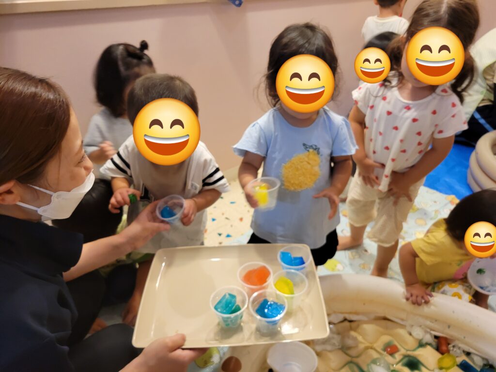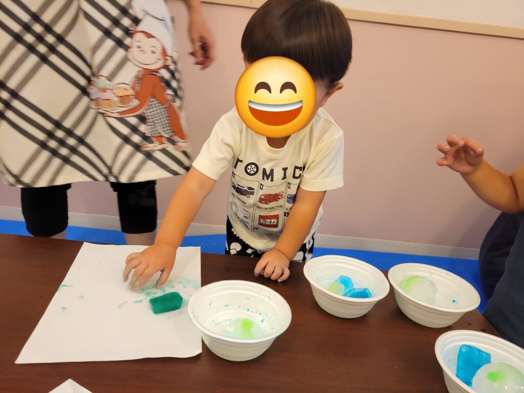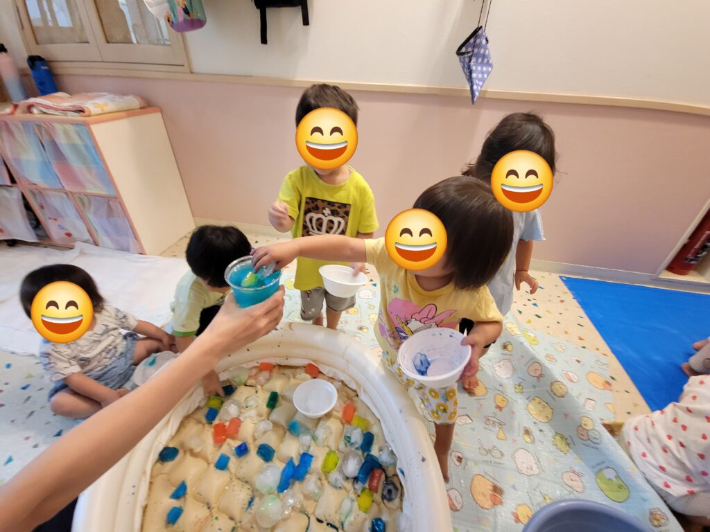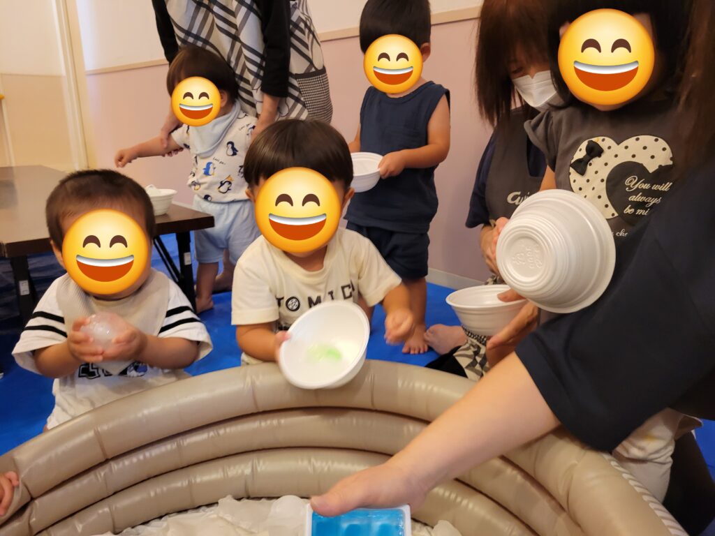 氷遊びの様子です。ひんやりツルツルした感触に驚くお友だちもいましたが、少しずつ慣れてくると気持ち良さや楽しさを感じてもらえたようで、皆でとても楽しい氷遊びとなりました。