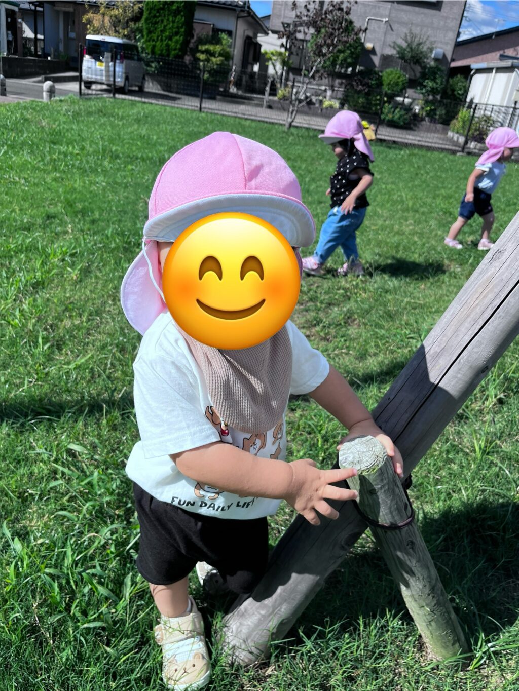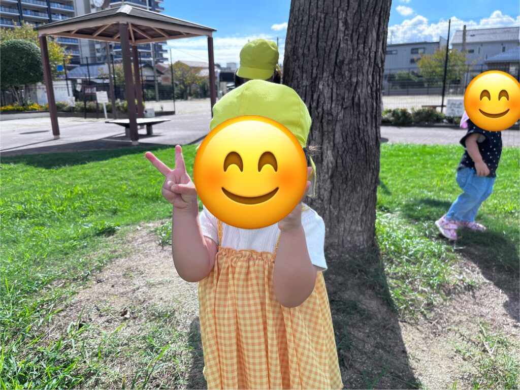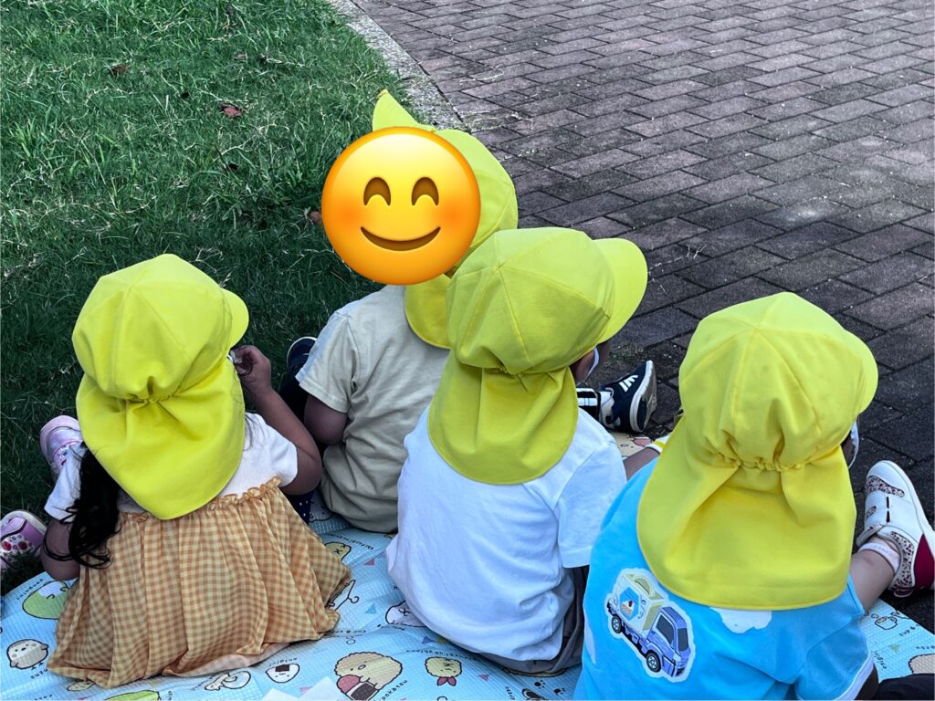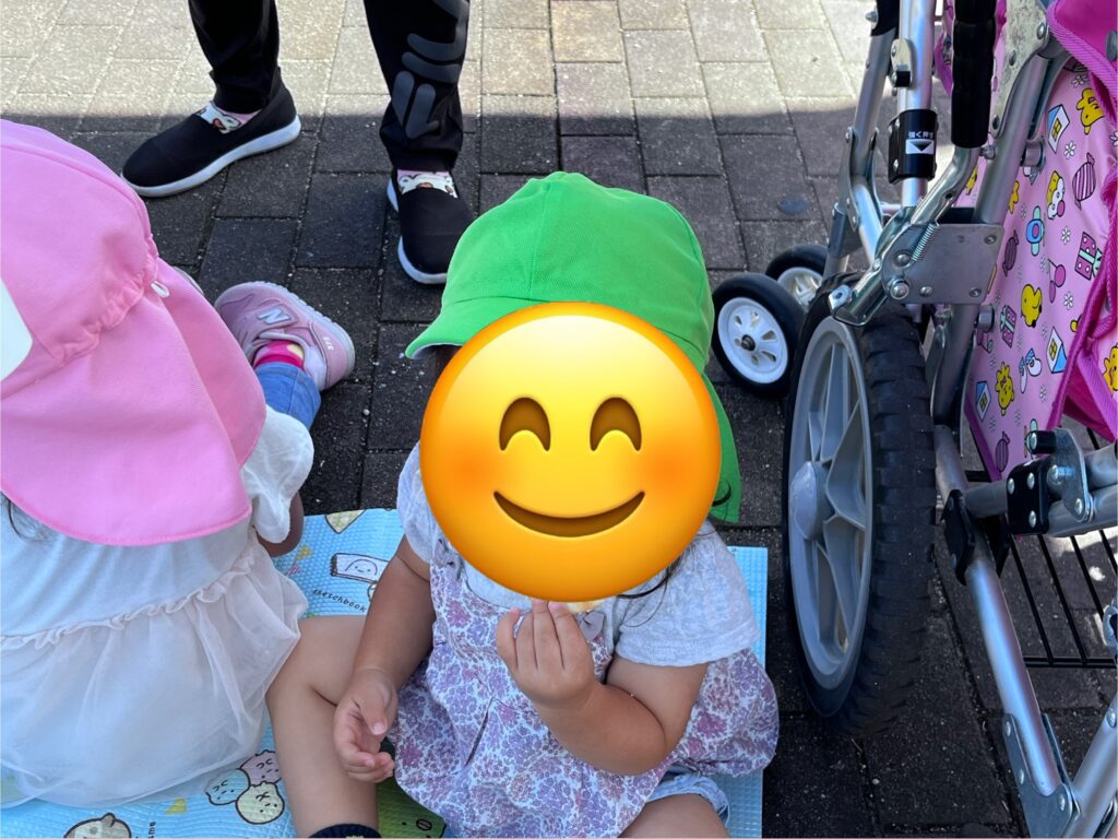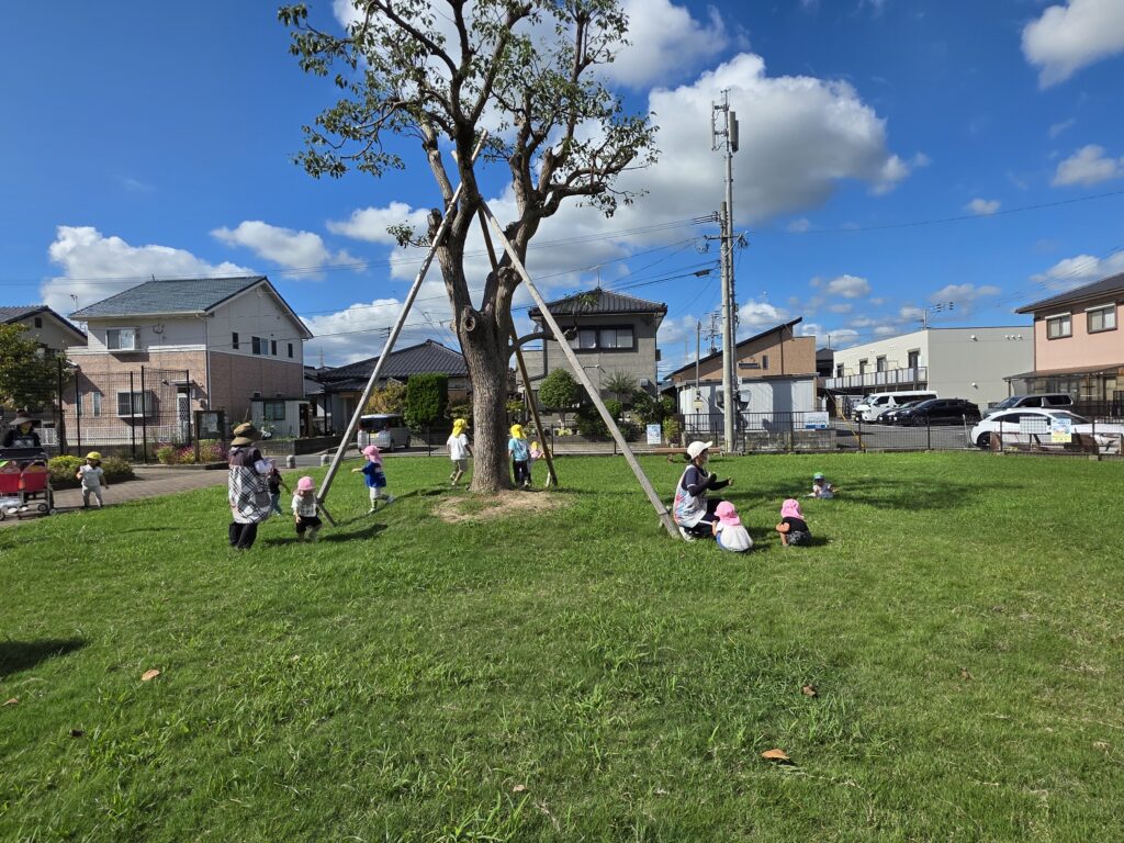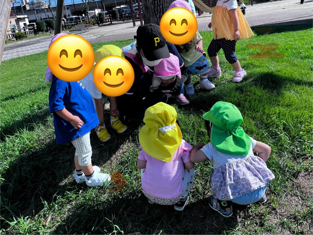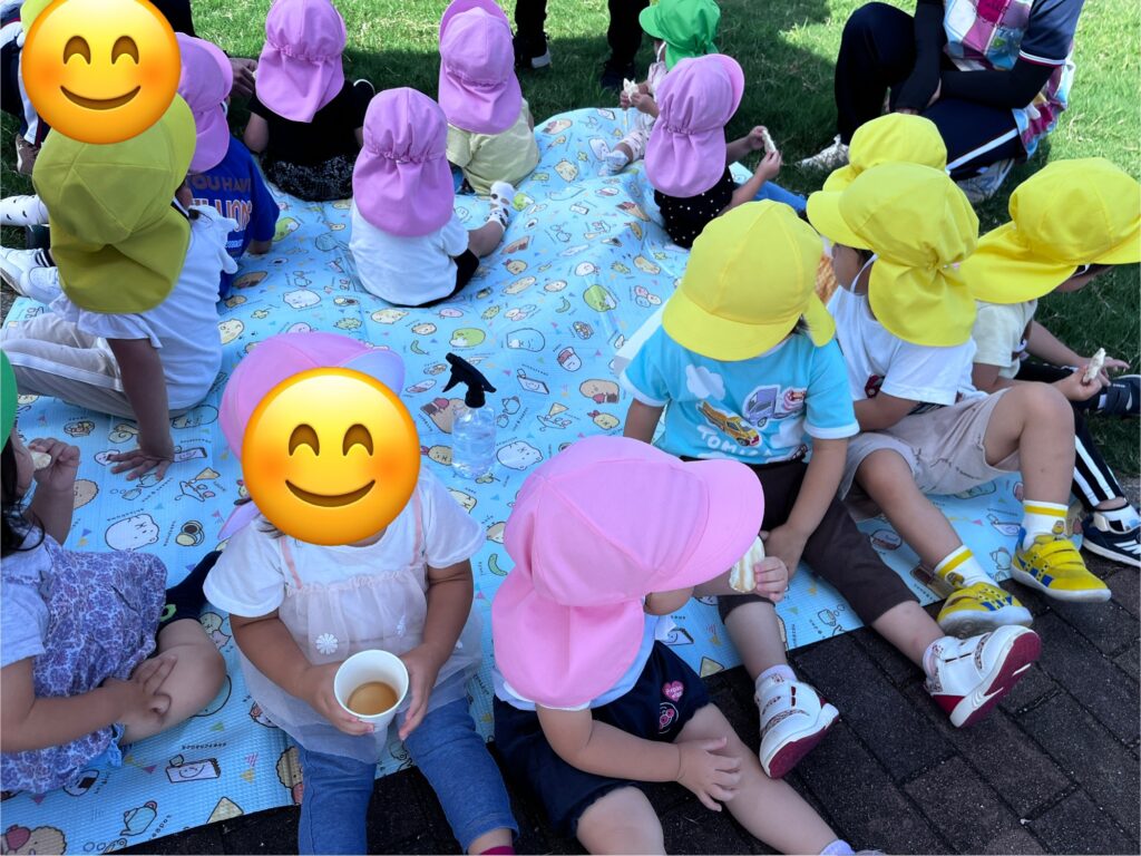 今日はふれあい公園の芝生でおやつを食べました。戸外で食べるおやつは一段と美味しかったようです。食べ終わった後は、公園で遊んだり草花を探したり色々な発見がありましたよ。