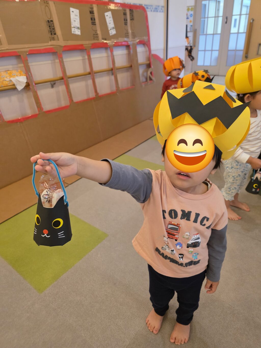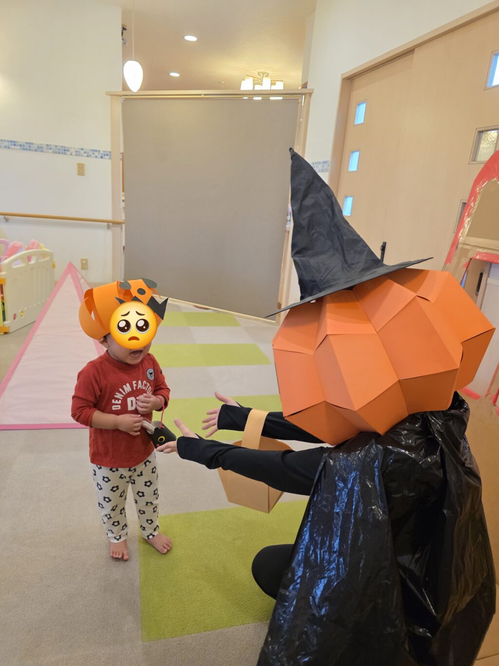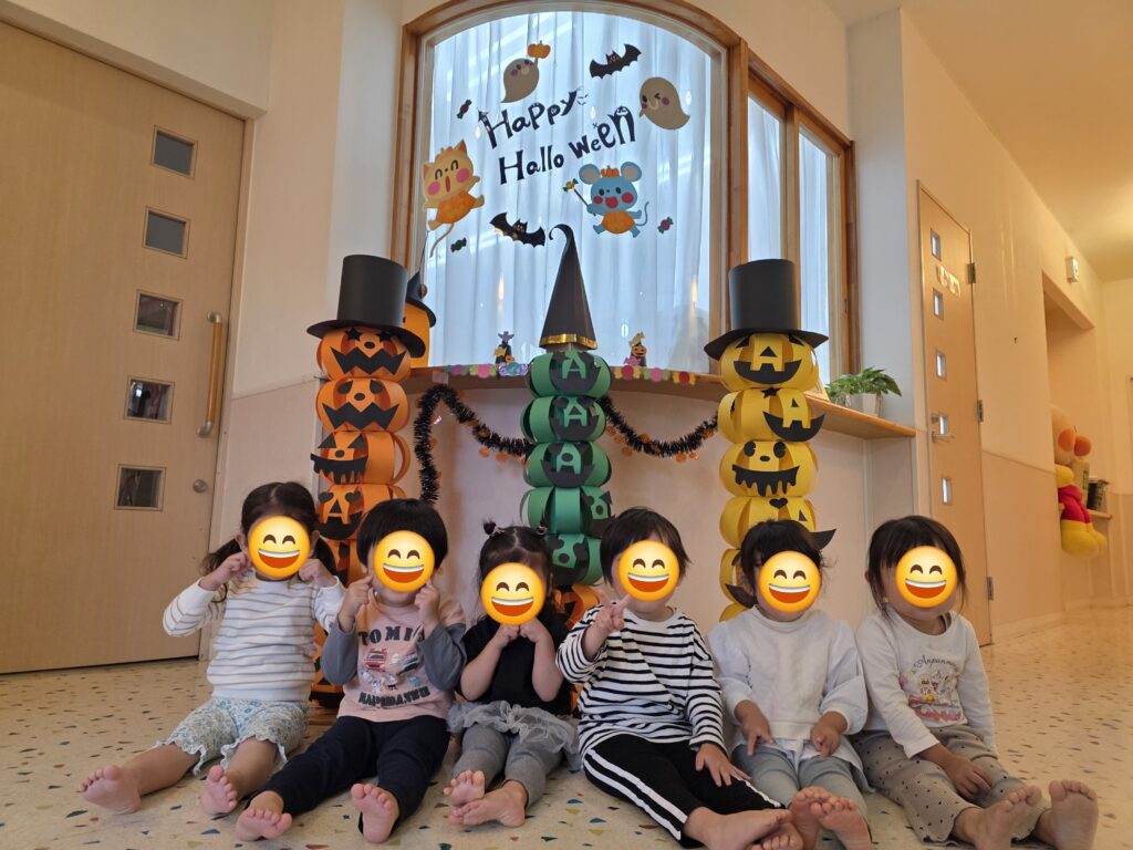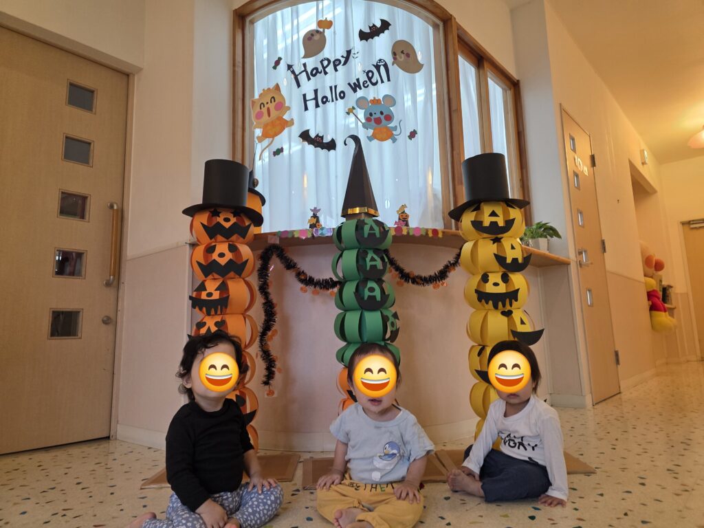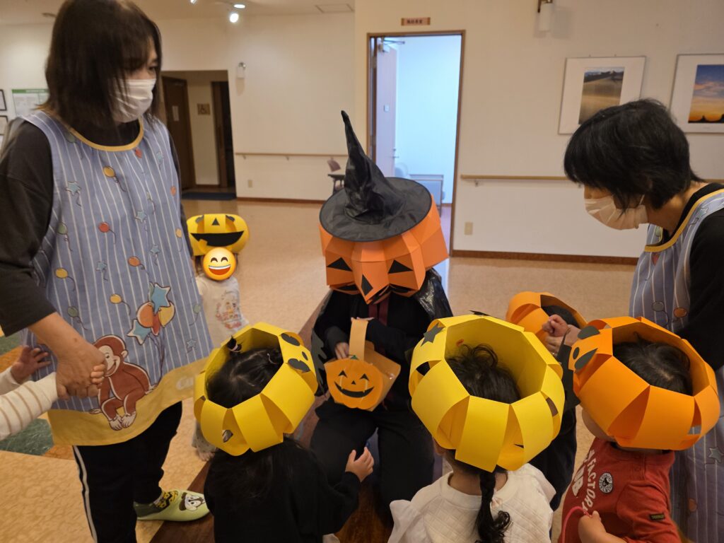数日前から玄関に飾っていた、かぼちゃの飾り✨なんと、子ども達の帽子に大変身!!かぼちゃの帽子をかぶって今年もハロウィンマンのところまでお菓子をもらいに行きました。上手に「トリックオアトリート♪」と言ってお菓子をもらえるお友だちもいれば、怖くて泣いてしまったお友だちも!!しかし、最後はみんなお菓子をもらえて笑顔いっぱいになりました😊