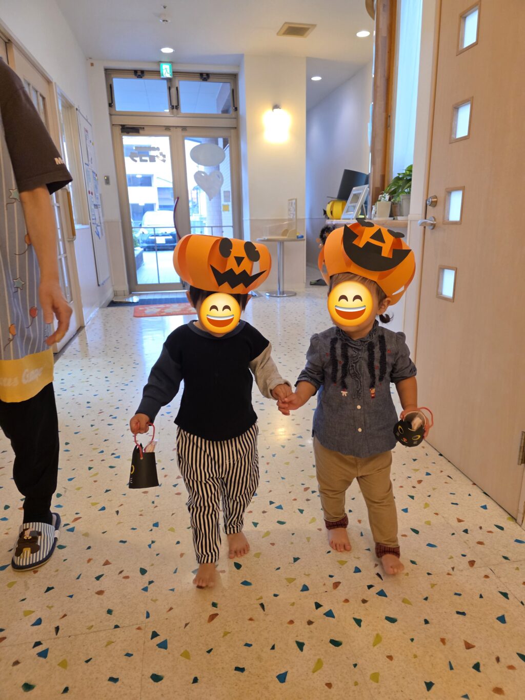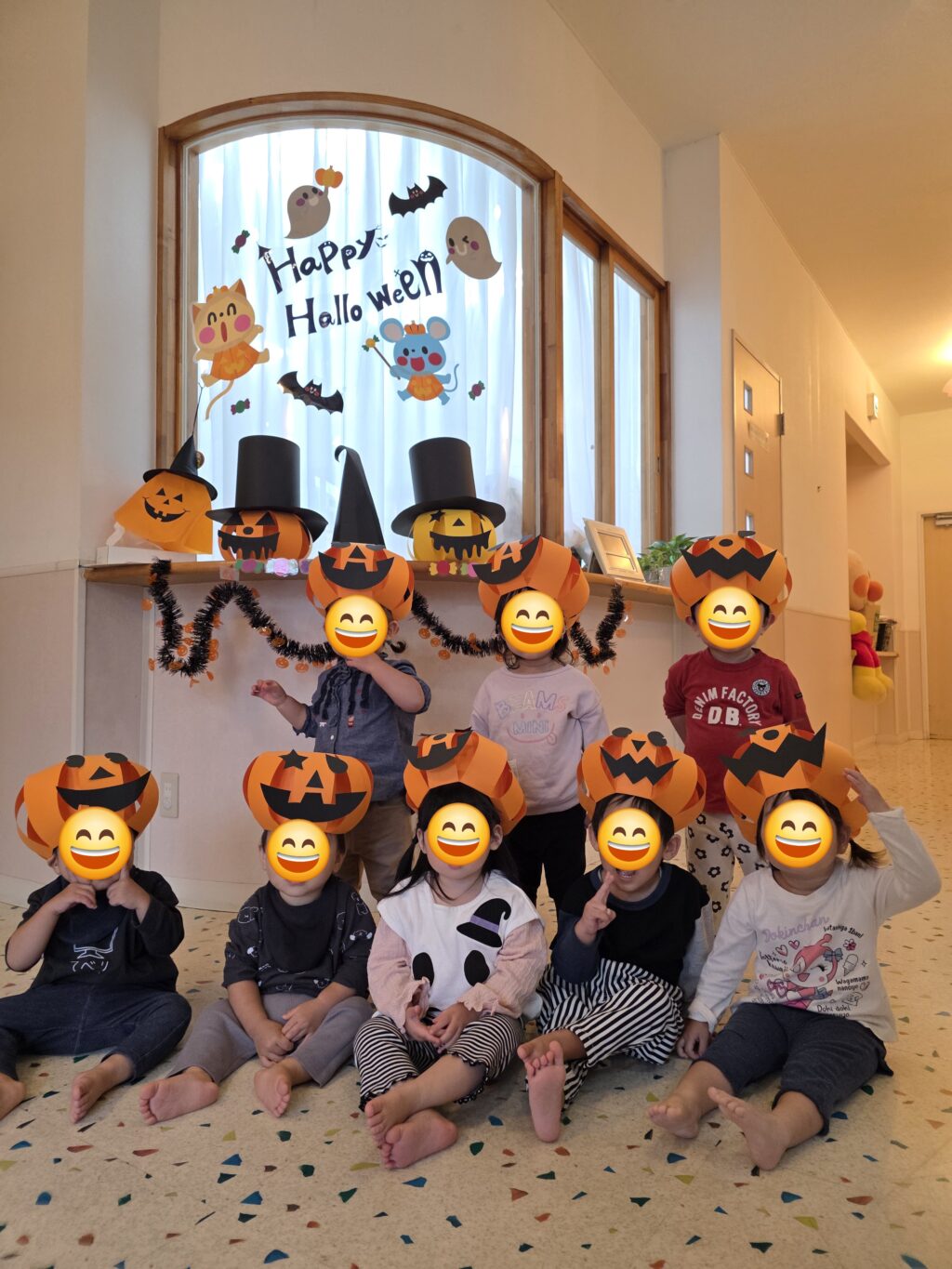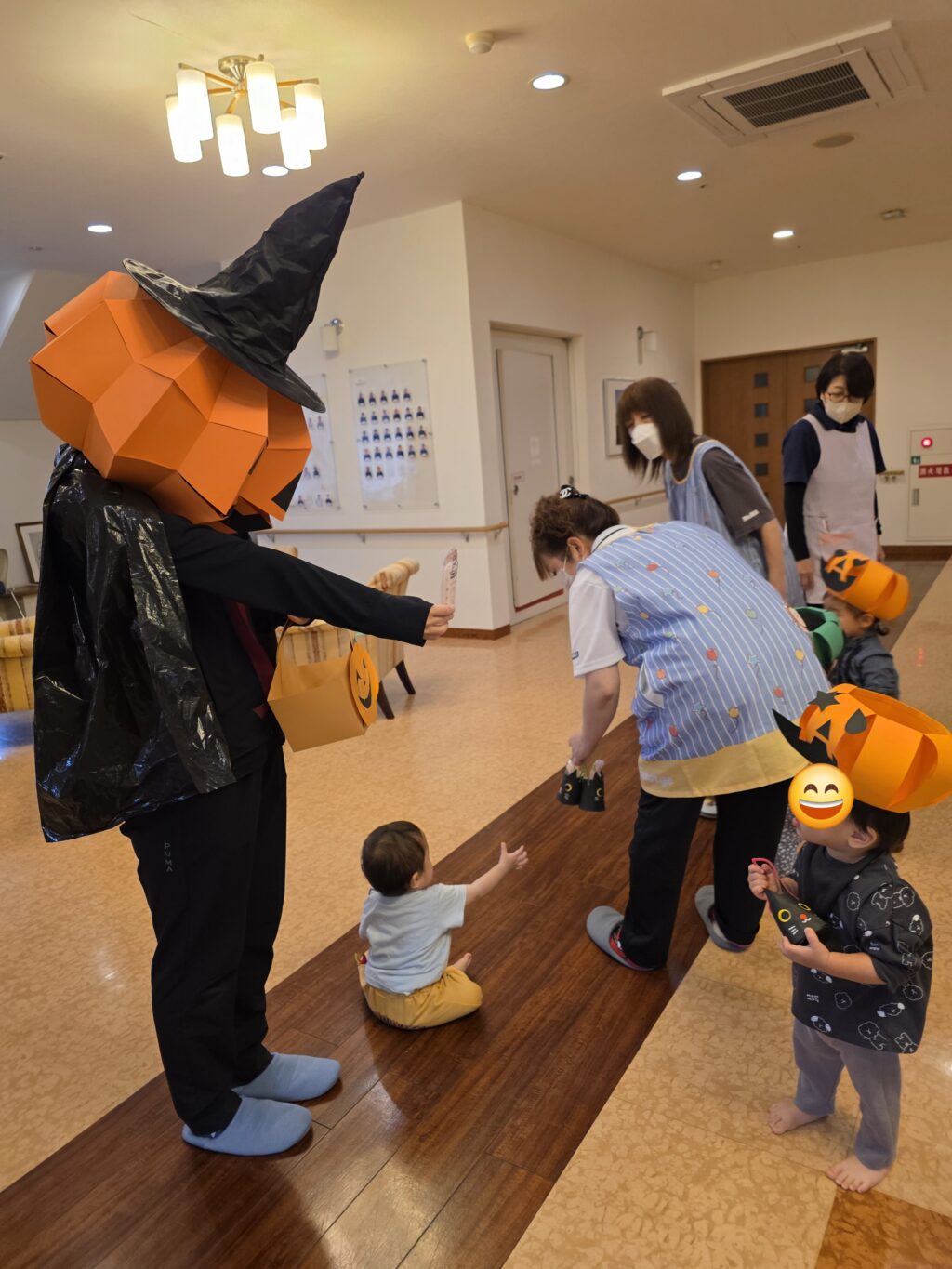 数日前から玄関に飾っていた、かぼちゃの飾り✨なんと、子ども達の帽子に大変身!!かぼちゃの帽子をかぶって今年もハロウィンマンのところまでお菓子をもらいに行きました。上手に「トリックオアトリート♪」と言ってお菓子をもらえるお友だちもいれば、怖くて泣いてしまったお友だちも!!しかし、最後はみんなお菓子をもらえて笑顔いっぱいになりました😊