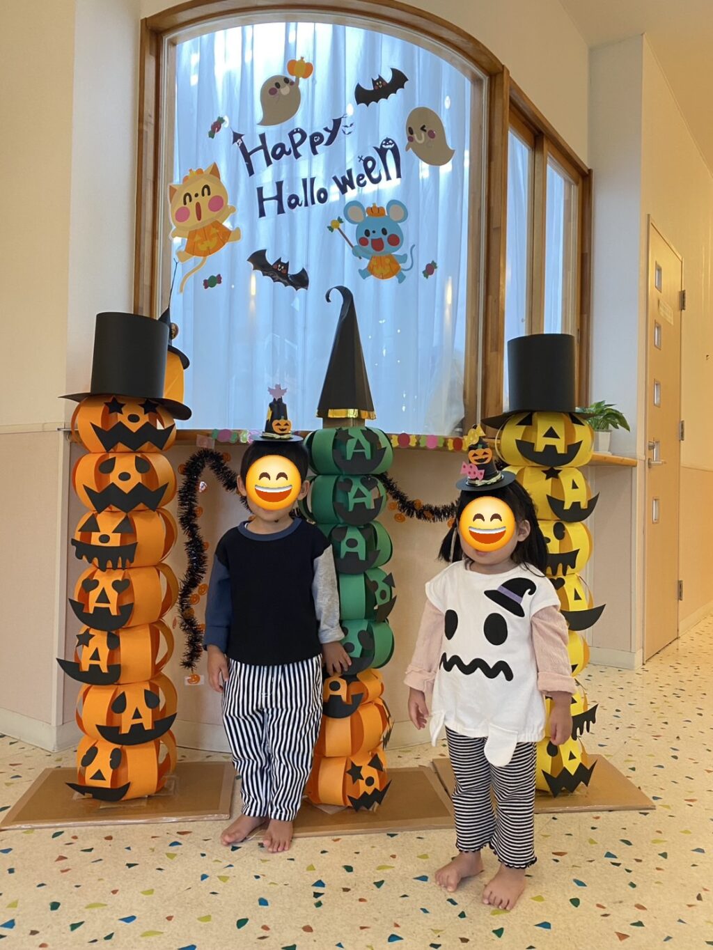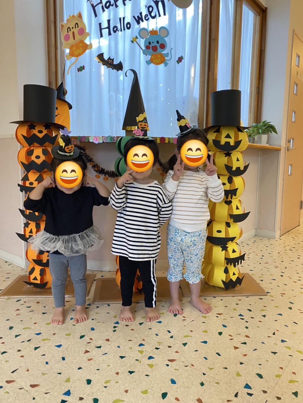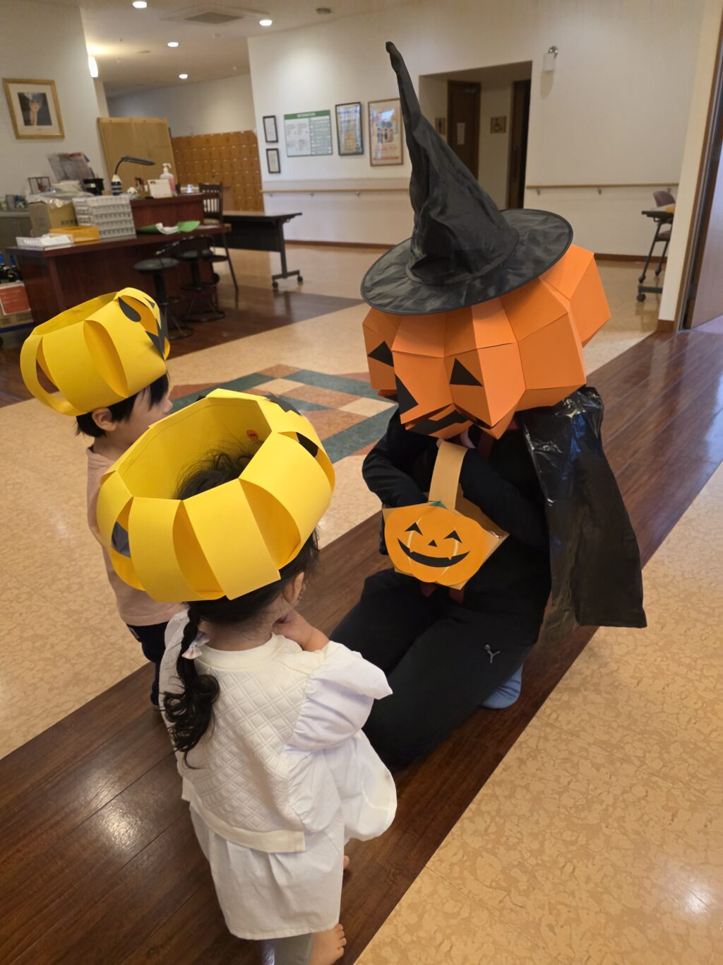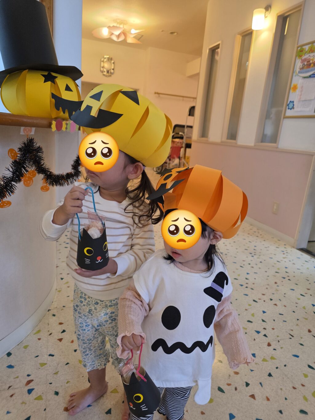 数日前から玄関に飾っていた、かぼちゃの飾り✨なんと、子ども達の帽子に大変身!!かぼちゃの帽子をかぶって今年もハロウィンマンのところまでお菓子をもらいに行きました。上手に「トリックオアトリート♪」と言ってお菓子をもらえるお友だちもいれば、怖くて泣いてしまったお友だちも!!しかし、最後はみんなお菓子をもらえて笑顔いっぱいになりました😊