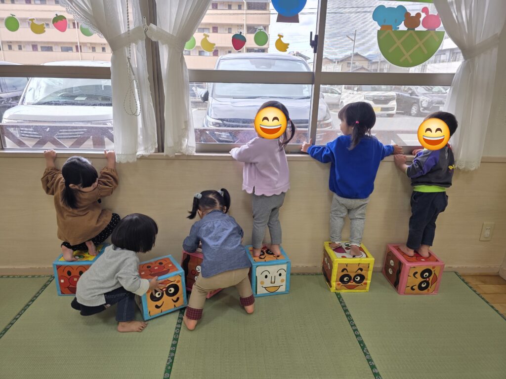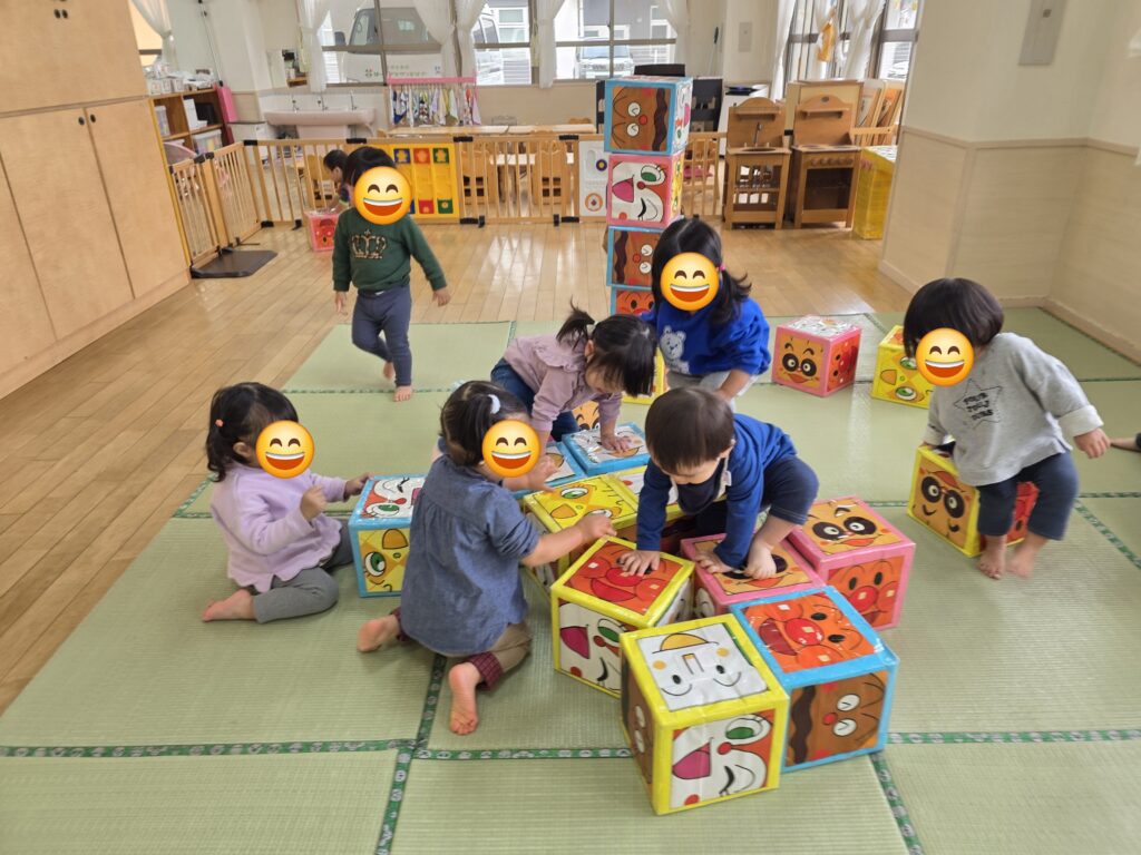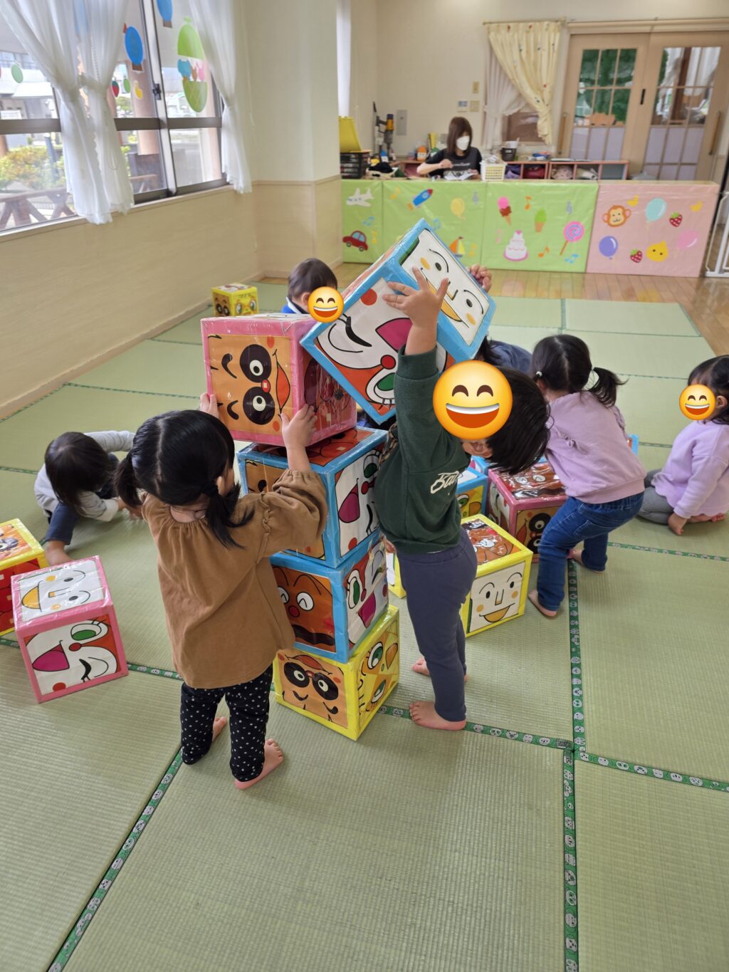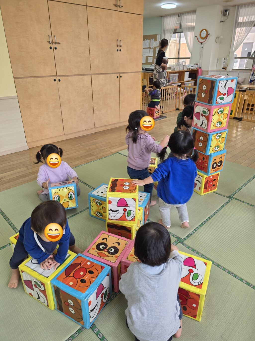 駅までお散歩に行きました。4月はまだ全員ベビーカーやお散歩車に乗っていた子ども達が今ではお散歩ロープを持って歩いてくれるようになり、後ろからその様子を見ていてすごく成長を感じました。また、園に戻ってからは大型ブロックで遊び、一緒に一つの場所に集めたり、協力して積み重ねたりとお友だちとの関わりも増え、とても嬉しく思いました。途中からはめろんぐみのお友だちも一緒だったのですが、何度も取られたり、壊されたりするなかで、「とらないで」「ぶっぶー✖」「だめだめ✖」と必死に言って止めようとしている姿にも成長を感じました。今日は、いちごぐみさんの成長を改めて感じる事ができました😊